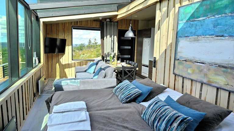 Die glasüberdachten Hütten im Northern Lights Village bieten den Gästen eine gemütliche Unterkunft mit modernen Annehmlichkeiten. Jede Kabine verfügt über eine Minibar, einen Wasserkocher und ein eigenes Bad mit Dusche. Die Zimmer sind komfortabel eingerichtet und bieten einen entspannten Rückzugsort nach einem Tag voller Aktivitäten.