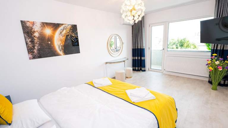Die Wohnung verfügt über ein Schlafzimmer und ein Badezimmer, sowie über eine voll ausgestattete Küche, einen Essbereich und einen Balkon mit Stadtblick. Zur technischen Ausstattung gehören Bettwäsche, Handtücher, ein Flachbild-TV mit Kabelkanälen und Klimaanlage. Die Unterkunft ist mit Gartenmöbeln und weiteren Annehmlichkeiten wie Videoüberwachung in den Gemeinschaftsbereichen ausgestattet. Ein Aufzug sowie Zugang mit Schlüssel sind ebenfalls vorhanden.