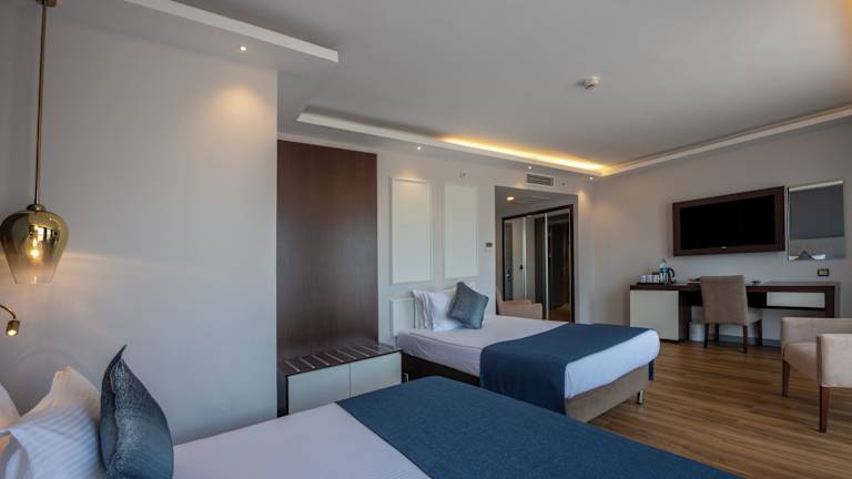 Die Zimmer sind mit Teppichboden ausgestattet und verfügen über eine Klimaanlage, Heizung, ein Doppelbett und Zustellbetten auf Anfrage. Weitere Annehmlichkeiten umfassen einen Safe, eine Minibar, Tee- und Kaffeezubereiter, einen Fernseher mit Satellitenempfang sowie ein Badezimmer mit Dusche und Badewanne. Familienzimmer und rollstuhlgerechte Zimmer sind ebenfalls verfügbar.