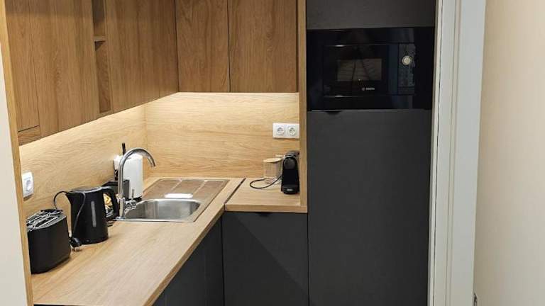 Die Ferienwohnung verfügt über ein Schlafzimmer, ein Wohnzimmer und eine voll ausgestattete Küche, die mit einem Kühlschrank und einer Kaffeemaschine ausgestattet ist. Das Badezimmer ist mit einer Dusche und kostenlosen Pflegeprodukten versehen. Handtücher und Bettwäsche werden bereitgestellt. Zur weiteren Ausstattung gehören Klimaanlage, Heizung und kostenloses WLAN.