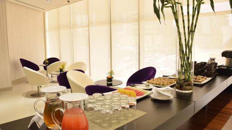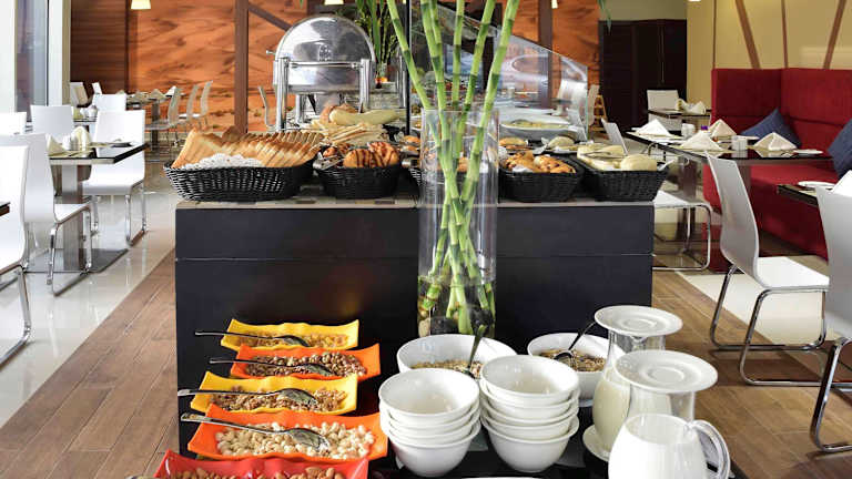 Das Dunes Restaurant im Hotel bietet ein Frühstücksbuffet und Abendessen in einem offenen Raum, der sich neben der Hotellobby befindet. Die großen Glasfenster bieten einen Blick auf den Kingdom Tower und sorgen für eine angenehme Atmosphäre während der Mahlzeiten.