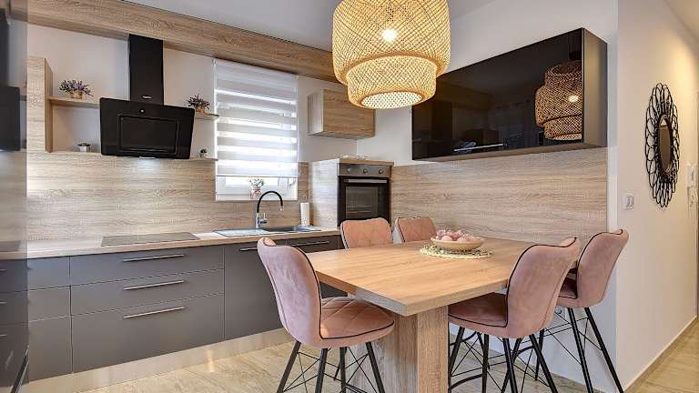 Die Ferienwohnung bietet eine Küchenzeile mit Kühlschrank und Geschirrspüler, ein Badezimmer mit Dusche sowie eine Terrasse. Zu den Annehmlichkeiten zählen kostenlose Pflegeprodukte, eine Waschmaschine, Handtücher und Bettwäsche.