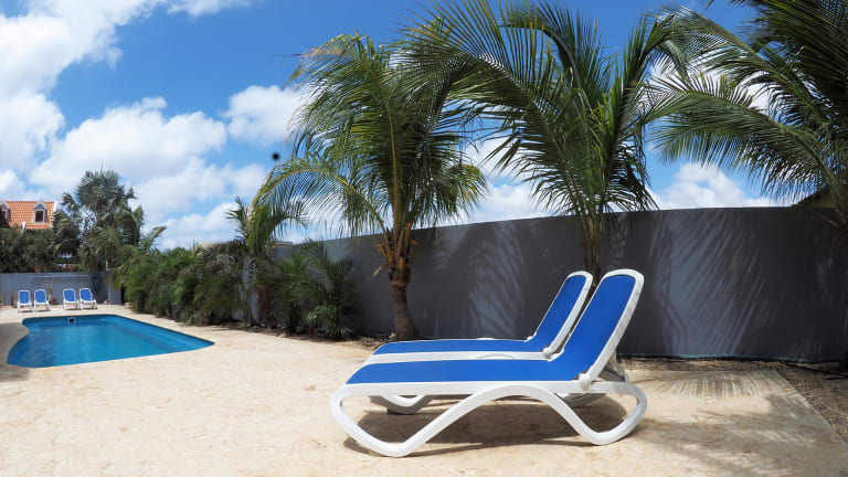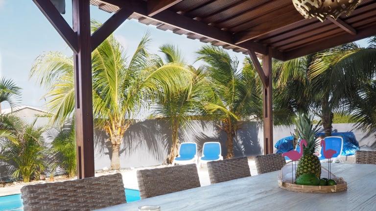 Unser Schwimmbad ist in den Garten integriert, umgeben von einer Terrasse aus Korallenstein der die Vorteile besitzt dass man bei einem nassen Boden nicht ausrutscht und der sich unter der Karibischen Sonne weniger erhitzt so dass man sich die Füße nicht verbrennt. Ohne zusätzliche Chemikalien zum reinigen durch die Verwendung einer Salzanlage für die Wasserpflege.Vorteile: Das Wasser hat kein Chlorgeruch, keine roten Augen, keine gebleichten Badeanzüge mehr, das Wasser fühlt sich sehr weich an und ist viel verträglicher für die Haut vor allem für Allergiker.