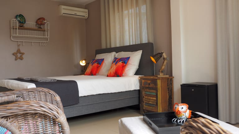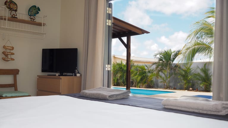 Das bietet unser Gästehaus, Komplett ausgestattete Zimmer mit eigenem Bad, Handtücher, Badetücher. Minibar, Safe und Flatscreen Fernseher. Ausführliches Frühstück das sie im Frühstücksraum oder draussen auf der Terasse beim Pool geniesen können. Mittags Snacks (Panini). Lunchbox zum mitnehmen "take a picknikbox". Ein mal wöchentlich BBQ. Shuttleservice. Mietwagen und Tauchpakete über unser Gästehaus buchbar. Jedes Zimmer hat sein eigener Parkplatz vor dem Hotel. Gratis WLAN.