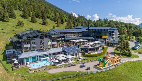 Atme durch mit deiner Familie. Das Vier-Sterne-Superior-Hotel ist herrlich gelegen auf 1200 Metern inmitten des eindrucksvollen Allgäuer Bergpanoramas im Luftkurort Oberjoch, der laut Deutschem Skiverband das beste Familien-Skigebiet der Alpen bietet. Über allen Gipfeln ist Spaß. Deine Kinder werden täglich von morgens bis abends durch unsere 25 erfahrenen PädagogInnen einfühlsam betreut – in fünf altersgerecht gestalteten Clubs vom Baby- bis zum Teenie-Alter auf über 2.000 m² Fläche. Schon ab dem 7ten Lebenstag kommen Babys bei uns in den Urlaubsgenuss und erleben fürsorgliche Zuwendung. Höhepunkte für alle gibt es zahlreiche: Softplayanlage, Kino & Theater mit täglichem Programm, Kartbahn, Turnhalle, Familien-Bowlingbahn und 5.000 m² Außenanlage mit Kletterwald sowie Rodelbahn und „Windelskischule“, die schon Zweijährigen die ersten Schwünge auf den Brettern ermöglicht. Wer einmal unsere Alpakas, Ponys und Esel zurück in den Stall begleitet, fühlt sich leicht als zukünftiger Pferdeflüsterer. Für nasse Action sorgen die längste Hotel-Reifenwasserrutsche Deutschlands, das Panorama-Hallenbad mit seinem Babyerlebnisbad und der Infinity-Außenpool. Erholung und unglaubliche Vielfalt an Aktivitäten. Mit dem guten Gefühl, deine Kinder optimal aufgehoben zu wissen, genießt du Zeit für dich selbst, die Entspannung in unserer vielfältigen Saunalandschaft, wohltuende Spa-Behandlungen oder den sensationellen Ausblick auf die Gipfel aus dem großzügigen, rundum verglasten Fitness-Center. Zum vollständigen Genuss-Erlebnis gehört auch die Gourmetküche den ganzen Tag über. Sportliche Aktivitäten warten direkt vor der Haustüre: die Bergwelt bietet traumhafte Wandergebiete und das mit beträchtlichen Investitionen modernisierte Skigebiet mit seinen 33 Pistenkilometern und dem großen Schneekinderland ist von unserem Resort aus leicht zu Fuß oder mit unserem eigenen Shuttle erreichbar.