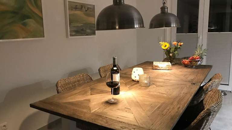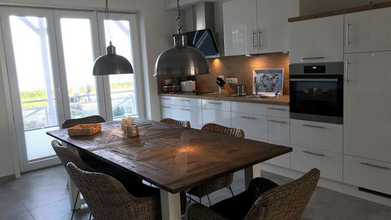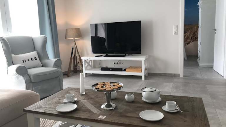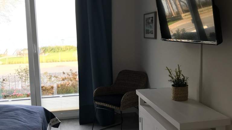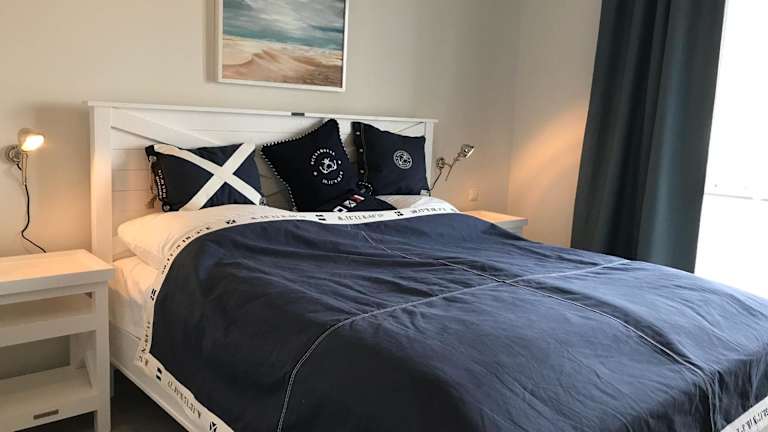 Die Ferienwohnung im Erdgeschoss umfasst zwei Schlafzimmer, einen Fernseher mit Satellitenkanälen und eine voll ausgestattete Küche mit Kühlschrank, Geschirrspüler, Waschmaschine, Ofen und Herdplatte. Zudem steht ein Balkon zur Verfügung, sowie ein Wasserkocher.