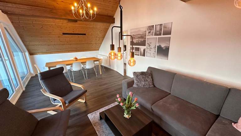 Die Ferienwohnung umfasst 3 Schlafzimmer, ein Wohnzimmer sowie 2 Badezimmer mit Dusche und Badewanne. Zur Ausstattung gehören ein Satelliten-Flachbild-TV und schallisolierte Zimmer. Weitere Annehmlichkeiten sind allergikerfreundliche Zimmer, eine Sonnenterrasse und Gartenmöbel.
