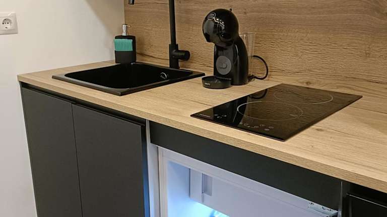Die Ferienwohnung verfügt über ein Schlafzimmer, ein Wohnzimmer und eine voll ausgestattete Küche, die mit einem Kühlschrank und einer Kaffeemaschine ausgestattet ist. Das Badezimmer bietet eine Dusche und kostenlose Pflegeprodukte. Handtücher und Bettwäsche werden bereitgestellt. Die gesamte Unterkunft ist klimatisiert.