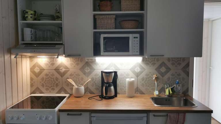 Das Old Finnish lakeside cottage with sauna bietet eine voll ausgestattete Küche, in der die Gäste ihre eigenen Mahlzeiten zubereiten können. Alternativ gibt es in der Nähe eine Vielzahl von Restaurants und Cafés, in denen Sie lokale und internationale Küche genießen können.