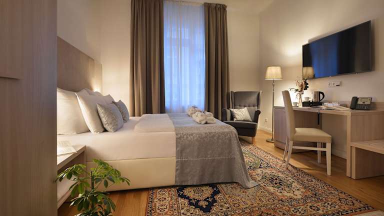 Die Zimmer liegen in der 5. Etage und sind modern eingerichtet. Jedes Zimmer verfügt über einen Sitzbereich, einen Schreibtisch, einen TV, ein Telefon und eine Klimaanlage. Die Ausstattung umfasst außerdem Pflegeprodukte von L'Occitane und Hausschuhe. Einige Zimmer bieten einen Blick auf den alten jüdischen Friedhof. Alle Zimmer sind Nichtraucherzimmer und werden täglich gereinigt.