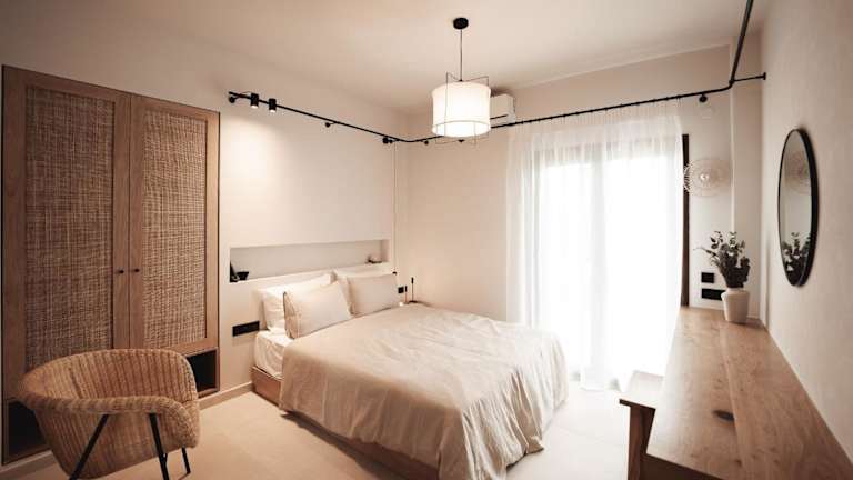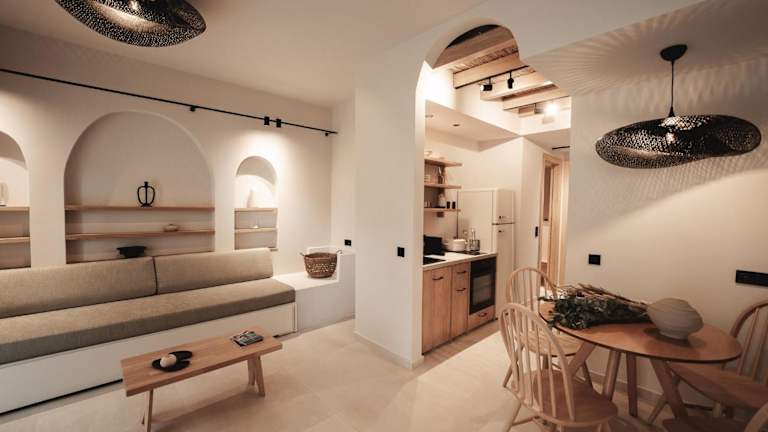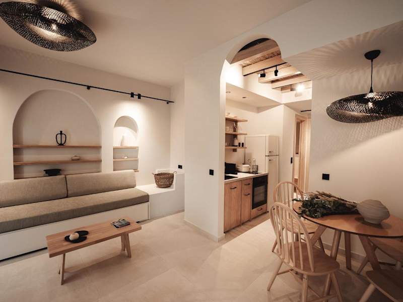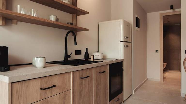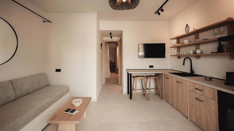 Die Zimmer in Om Living Afitos sind mit einer voll ausgestatteten Küche ausgestattet, die einen Kühlschrank, einen Ofen, eine Herdplatte, eine Kaffeemaschine und einen Wasserkocher umfasst. Des Weiteren bieten die Apartments ein eigenes Badezimmer mit Dusche und kostenlosen Pflegeprodukten sowie einen Flachbild-TV.