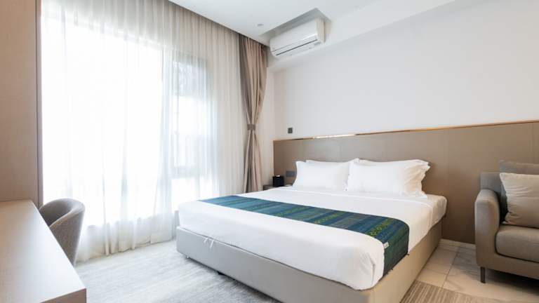 Die Zimmer verfügen über einen Schreibtisch, einen Flachbild-TV, ein eigenes Badezimmer, Bettwäsche und Handtücher. Ausstattung wie ein Safe und ein Kühlschrank stehen zur Verfügung, und einige Zimmer sind mit einem Balkon ausgestattet.