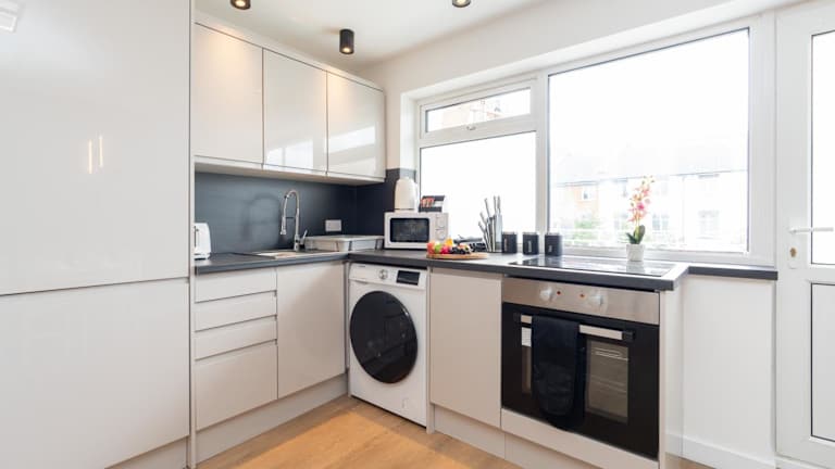 Die Küche ist mit einem Geschirrspüler und einem Ofen ausgestattet. Zusätzlich stehen eine Waschmaschine und zwei Badezimmer zur Verfügung. Handtücher und Bettwäsche werden bereitgestellt.