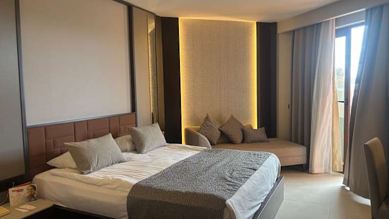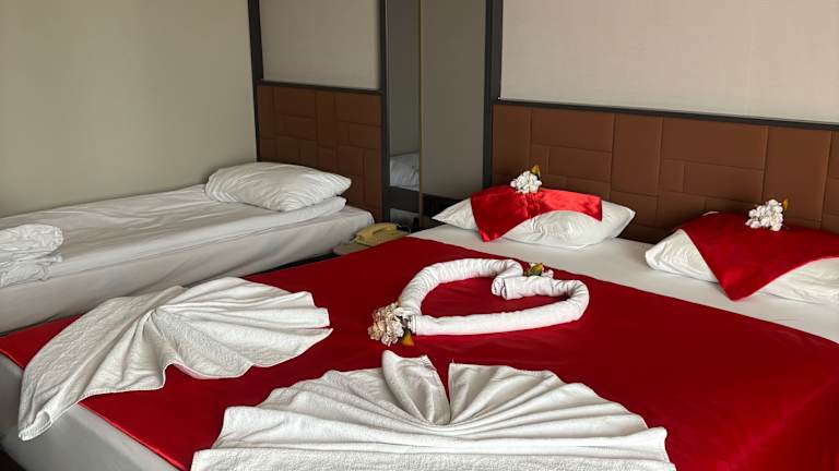 Standart Zimmerausstattung: - Laminatboden - Klimaanlage (zentral gesteuert) - LCD - TV mit Musikkanälen, - Minikühlschrank (bestückt mit Wasser, Mineralwasser und Softgetränken wird täglich aufgefüllt; kostenlos) - ebenerdige Dusche - direktwahl Telefon - Föhn, - Wasserkocher mit Kaffee/Tee Sortiment - Kosmetikspiegel - Safe (gegen Gebühr) - Bademantel (gegen Gebühr) Superior Zimmer: ca. 33 ㎡ mit spezieller Zimmerausstattung, bestehend aus einem King-Size Doppelbett, Badezimmer mit 2 Waschbecken und getrennte Dusche und WC, VIP Setup, Bademantel, Kissenmenü und Großbildschirm LED TV und „Willkommensgruß“ King Suite: ca. 85 ㎡ mit spezieller Zimmerausstattung, bestehend aus einem King-Size Doppelbett und Jacuzzi im Zimmer, Umkleideraum, Marmor-Badezimmer mit 2 Waschbecken und getrennte Dusche und WC, VIP Setup, Turn Down Service, Bademantel, Kissenmenü und Großbildschirm LED TV, großer Balkon mit Sitzgarnitur und Liege, Frühstück aufs Zimmer und und „Willkommensgruß“. Economy Zimmer: * Standart Ausstattung * ein Doppelbett * ohne Balkon Standart Zimmer: * Standart Ausstattung * ein Doppel und ein Einzelbett * mit Balkon Familienzimmer: * 2 Zimmer mit Verbindungstür * erstes Zimmer mit 2 Einzelbetten + Fernseher * zweites Zimmer mit einem Doppelbett + Fernseher * ein Badezimmer * mit Balkon Behindertenfreundliche Zimmer: * Standart Ausstattung * ein Doppelbett * nach den internationalen Normen eingerichtet. Hoteleigene Bereiche sind barrierfrei und mit Aufzügen erreichbar.