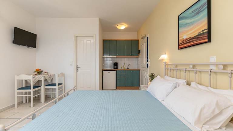 Die Studios und Apartments im Orkos View Hotel sind in einem traditionell kykladischen Stil gestaltet und bieten eine helle und gemütliche Atmosphäre. Jede Unterkunft verfügt über eine möblierte Terrasse, von der aus Sie einen atemberaubenden Panoramablick auf die Ägäis genießen können. Die Zimmer sind klimatisiert und verfügen über einen TV sowie eine Küchenzeile mit Kochplatten und einem Esstisch. Einige Zimmer bieten auch ein separates Schlafzimmer für zusätzlichen Komfort und Privatsphäre.