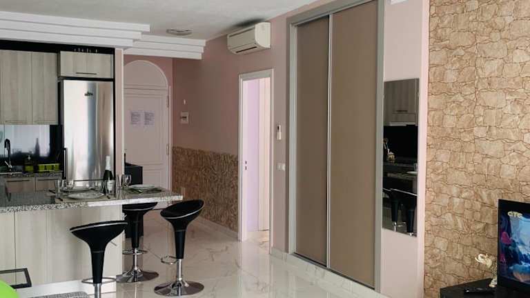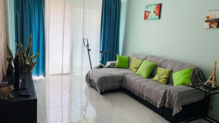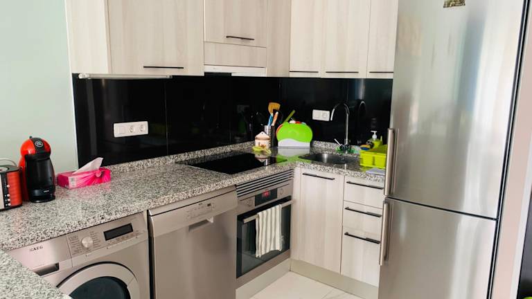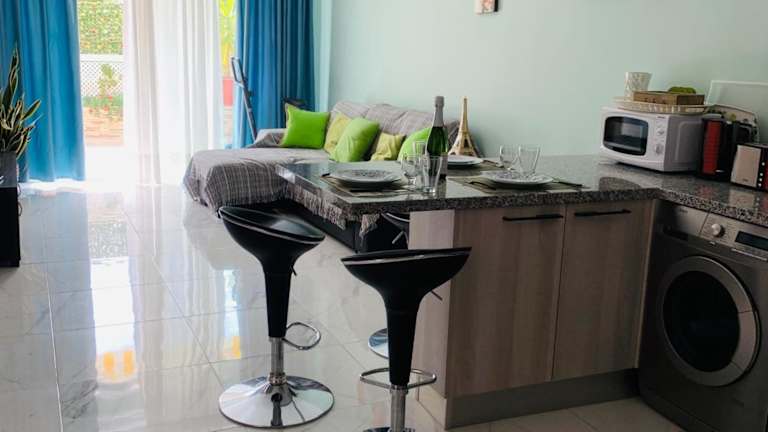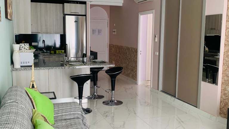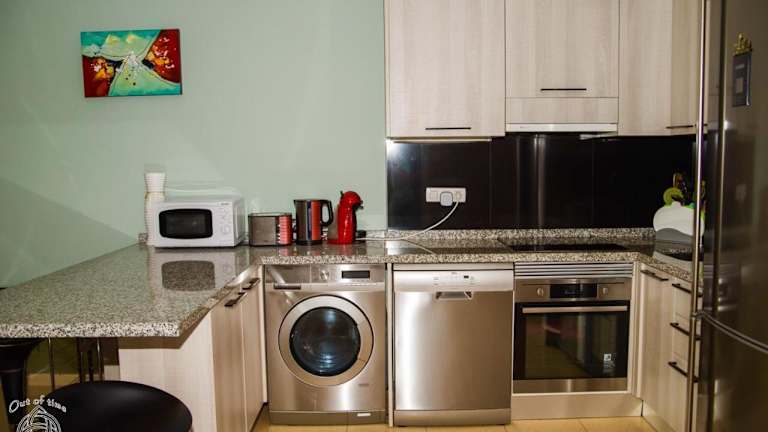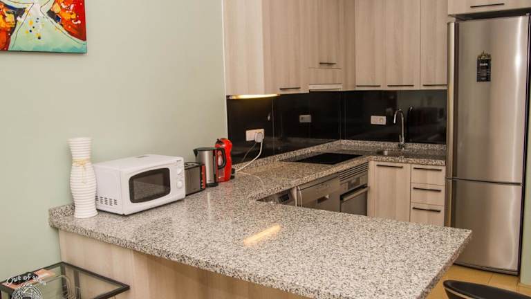 Die Ferienwohnung umfasst ein Schlafzimmer, ein Wohnzimmer sowie eine voll ausgestattete Küche mit Kühlschrank und Kaffeemaschine. Das Badezimmer ist mit einem Bidet und einer Dusche ausgestattet. Zur Ausstattung gehören Klimaanlage, Schallisolierung, Handtücher und Bettwäsche.