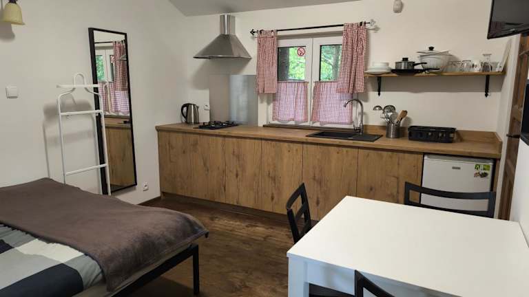 Die Zimmer im Osada pod Czerwonym Dębem - Czarny Młyn sind geräumig und bieten allen Komfort, den Sie für einen angenehmen Aufenthalt benötigen. Jedes Zimmer verfügt über einen TV, einen Esstisch und eine Küchenzeile mit einem Kühlschrank. Das Badezimmer ist mit einer Dusche ausgestattet. Hier können Sie sich wie zu Hause fühlen und Ihren Aufenthalt in vollen Zügen genießen.