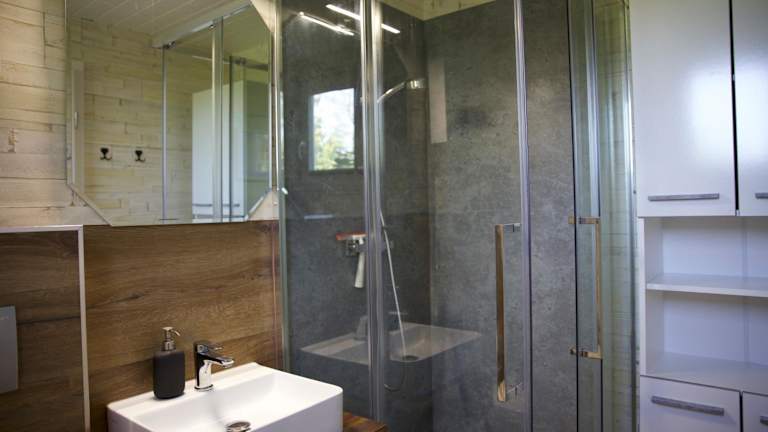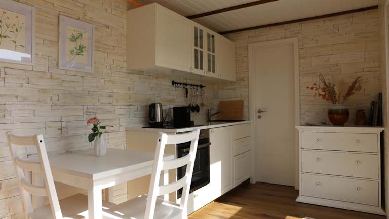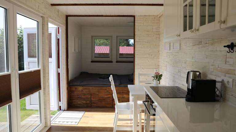 Das Ostsee Tiny Haus Rotkehlchen bietet ein Schlafzimmer und ein Wohnzimmer. Die Zimmer sind mit einem Badezimmer ausgestattet, das eine Dusche und einen Haartrockner umfasst. Handtücher und Bettwäsche werden bereitgestellt. Die Einrichtung ist modern und sorgt für einen komfortablen Aufenthalt.
