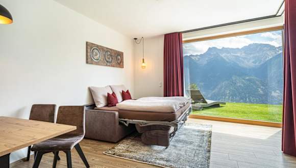 Die Unterkunft Paflur Lodges Abendrot befindet sich in Laas, umgeben von einer naturnahen Umgebung, die sich besonders zum Wandern und Fahrradfahren eignet.