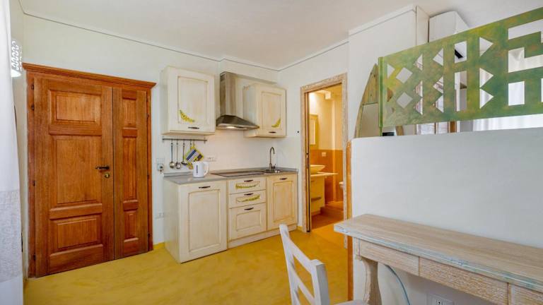 Jede Wohneinheit verfügt über eine voll ausgestattete Küchenzeile mit einem Esstisch, einem Kühlschrank, einer Mikrowelle, einer Herdplatte sowie einem Wasserkocher.