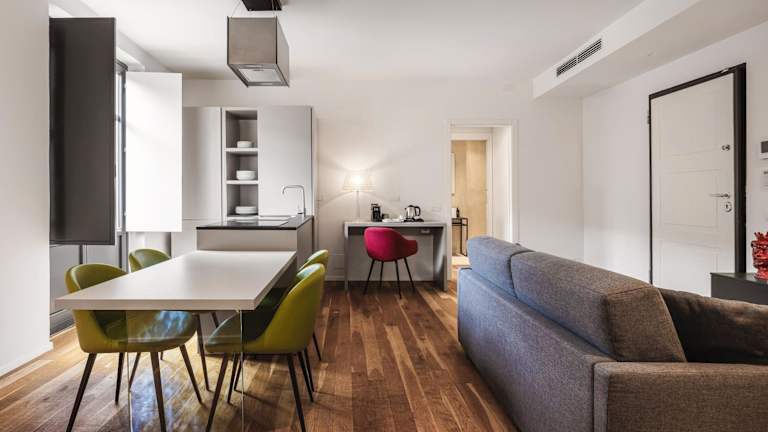 Die klimatisierten Zimmer sind ausgestattet mit Schreibtisch, Wasserkocher, Kühlschrank, Minibar, Safe, Flachbild-TV und eigenem Badezimmer mit Bidet. Einige Zimmer verfügen über einen Balkon mit Stadtblick sowie eine Küche, die mit Ofen, Mikrowelle und Herdplatte ausgestattet ist. Alle Zimmer sind mit Bettwäsche und Handtüchern ausgestattet.