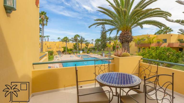 Die Ferienwohnung umfasst ein Schlafzimmer, ein Wohnzimmer, ein gut ausgestattetes Badezimmer mit Dusche, eine Küche mit Kühlschrank und Mikrowelle sowie eine Terrasse mit Poolblick. Zur Ausstattung gehören Flachbild-TV, Handtücher und Bettwäsche.