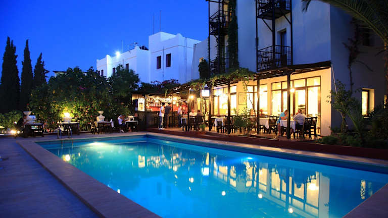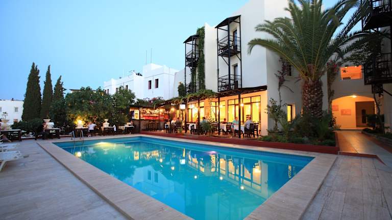Das Hotel Paloma in Bodrum/Gümbet bietet seinen Gästen eine attraktive Lage im touristischen Zentrum von Bodrum. Nur etwa 500 Meter vom Sand-/Kiesstrand entfernt gelegen, finden Sie hier zahlreiche Einkaufsmöglichkeiten, Restaurants, Bars und Diskotheken in unmittelbarer Nähe. Das Hotel verfügt über 58 Doppelzimmer, die sich sowohl im Haupthaus als auch in den Nebengebäuden befinden. Zur Ausstattung gehören ein Außenpool, ein Garten, ein Spielplatz, ein TV-Raum und ein Spielzimmer. WLAN ist gegen Gebühr verfügbar. Das gastronomische Angebot umfasst eine Bar sowie ein Nichtraucherrestaurant. Das Hotel bietet Übernachtung inklusive Frühstück und Halbpension an. Sportbegeisterte Gäste können den Billardtisch nutzen. Familien mit Kindern werden sich über den Kinderpool, das Kinderspielzimmer und den Kinderspielplatz freuen. Die Zimmer sind mit Klimaanlage, Balkon oder Terrasse, Doppelbett, Safe, Minibar, Mikrowelle, Tee-/Kaffeemaschine, Telefon, Sat-TV und WLAN ausgestattet.
