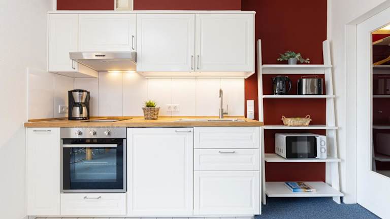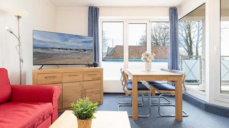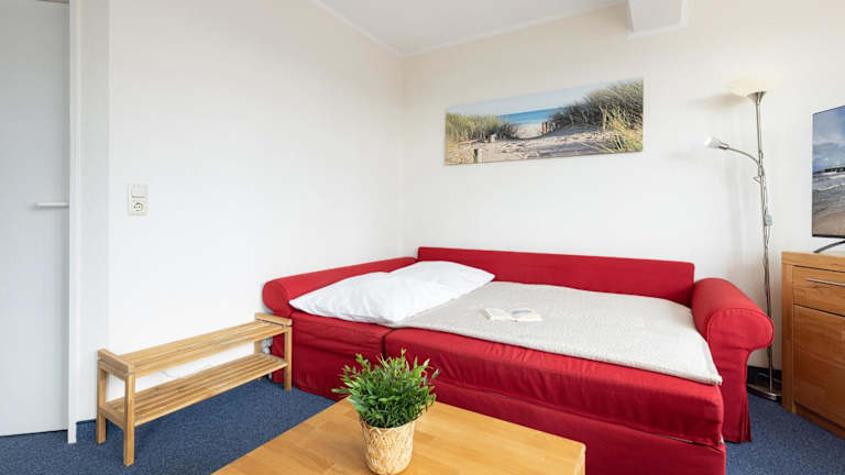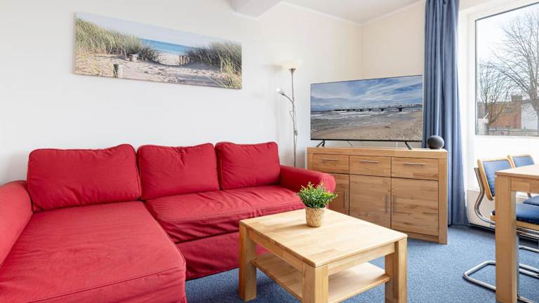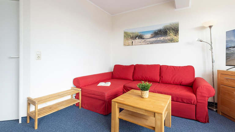 Die Ferienwohnung besteht aus einem Balkon, einem Schlafzimmer, einem Wohnzimmer sowie einer gut ausgestatteten Küche, die mit einem Kühlschrank und einem Ofen ausgestattet ist. Zur technischen Ausstattung gehört ein TV mit Kabelkanälen. Es sind zusätzlich Babybetten für Kinder von 0 bis 2 Jahren verfügbar.