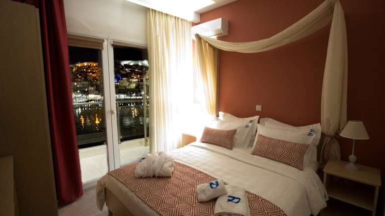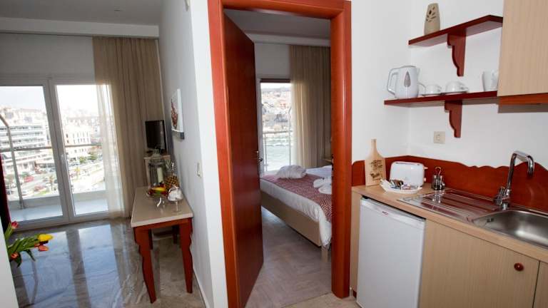 Die klimatisierten Unterkünfte der Panorama Junior Suites bieten einen beeindruckenden Meerblick. Jedes Zimmer verfügt über eine Terrasse mit Blick auf die Stadt, einen Flachbild-Sat-TV und eine gut ausgestattete Küchenzeile. Im eigenen Bad finden Sie eine Dusche, einen Haartrockner und Hausschuhe vor. Zur Ausstattung gehören auch ein Kühlschrank, ein Kochfeld, ein Toaster und ein Wasserkocher, so dass Sie sich bequem selbst versorgen können.