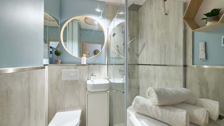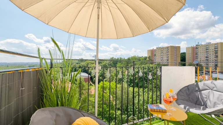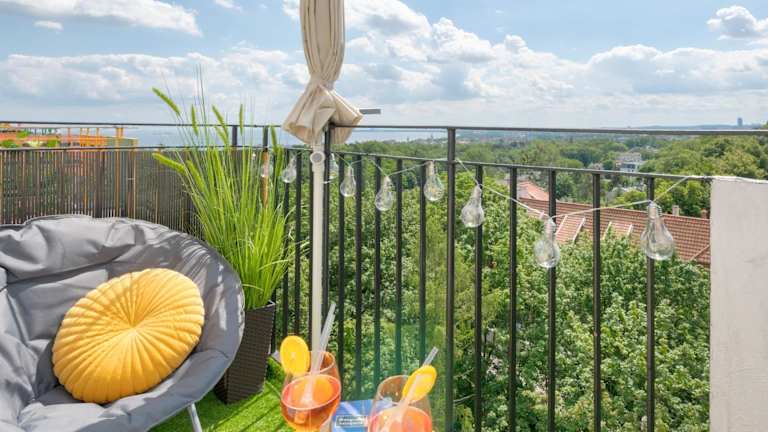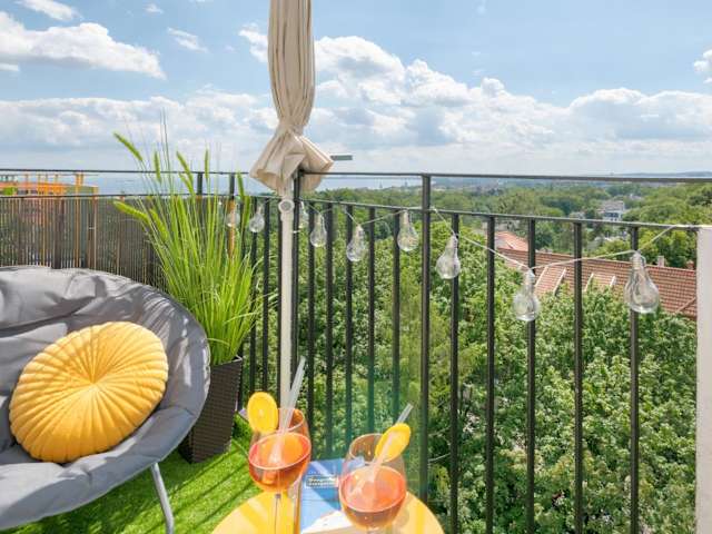 Die Ferienwohnung bietet Platz mit 2 Schlafzimmern und einem Wohnzimmer. Zur Ausstattung gehören ein Flachbild-TV, eine gut ausgestattete Küche mit Kühlschrank und Geschirrspüler sowie ein Badezimmer mit Dusche. Handtücher und Bettwäsche werden bereitgestellt. Ein Balkon mit Stadtblick ist ebenfalls vorhanden.