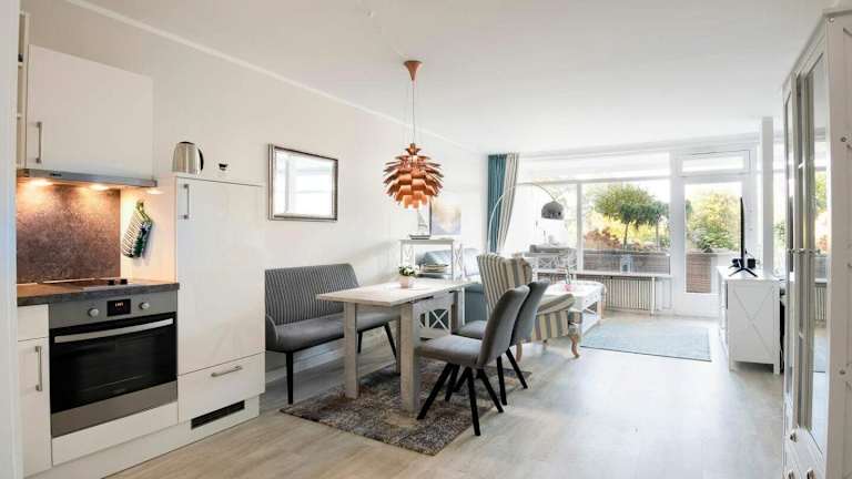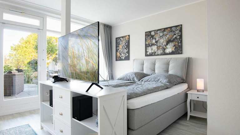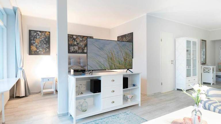 Die Ferienwohnung umfasst ein Schlafzimmer, ein Wohnzimmer mit einem Flachbild-TV mit Kabelkanälen, sowie eine gut ausgestattete Küche, die mit einem Kühlschrank und einem Geschirrspüler ausgestattet ist. Des Weiteren steht ein Badezimmer mit einer Dusche zur Verfügung.