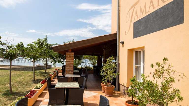 Das Hotel-Pension Tamaris befindet sich in der malerischen St. Euphemius-Bucht auf der Insel Rab. Der Strand ist nur 2 Gehminuten entfernt und die charmante Altstadt erreichen Sie nach einem 10-minütigen Spaziergang. Die Lage des Hotels ermöglicht es Ihnen, die Schönheit der Insel zu erkunden und gleichzeitig die Nähe zum Meer zu genießen. Vor dem Hotel gibt es Ankerplätze für Boote, so dass auch Wassersportbegeisterte hier voll auf ihre Kosten kommen.