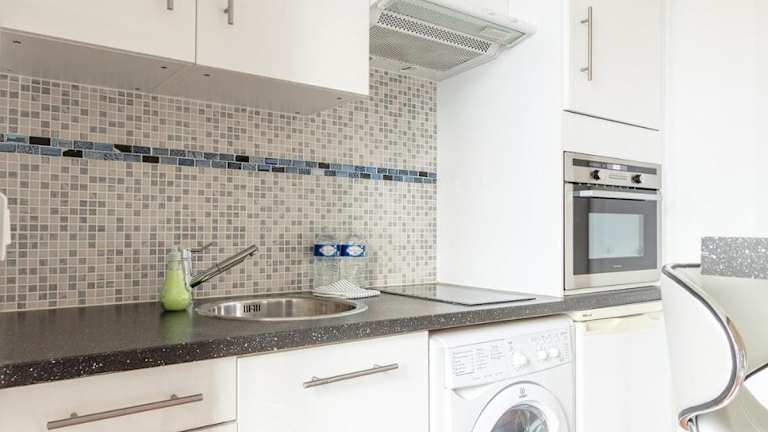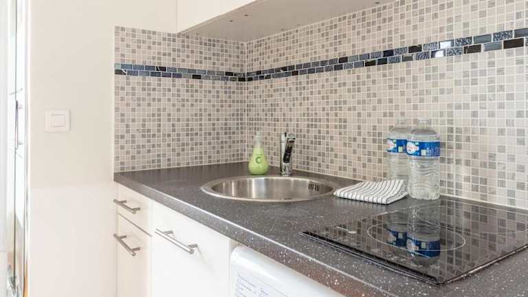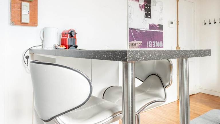 Die Wohnung ist mit einer Küchenzeile ausgestattet, die einen Kühlschrank, eine Mikrowelle, eine Herdplatte, eine Kaffeemaschine und einen Wasserkocher beinhaltet.