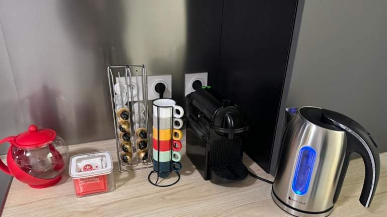 Die Unterkunft verfügt über eine voll ausgestattete Küche mit einem Kühlschrank und einer Kaffeemaschine, die die Zubereitung eigener Mahlzeiten ermöglicht.