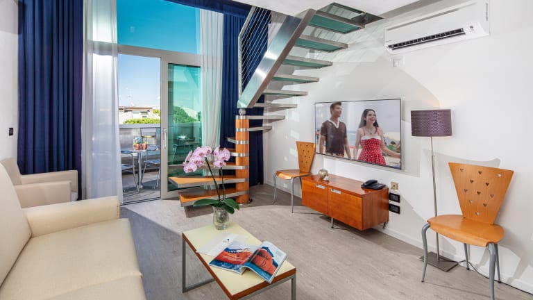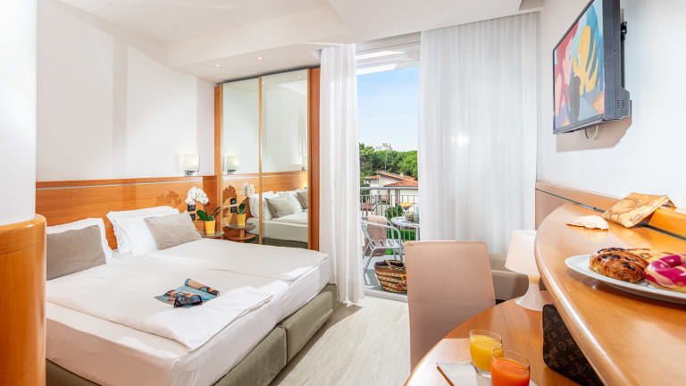 Die hellen und eleganten Zimmer des Hotels verfügen alle über einen Balkon mit Blick auf den Pool oder die Palmenterrasse. Sie sind ausgestattet mit Klimaanlage, Fernseher mit Satellitenantenne, Telefon mit Direktwahl, Bad mit Duschkabine, Fön, Minibar und Safe (gratis). Außerdem stehen im Park Hotel in Lignano Sabbiadoro fünf Suiten zur Verfügung, die auf zwei Stockwerke aufgeteilt sind, für einen hochwertigen Urlaub und mit jedem Komfort ausgestattet sind. Im ersten Stock befindet sich der Wohnraum mit gemütlichem Sofa, das als Doppelbett verwendet werden kann, eine kleine Kochnische, Bad mit Duschkabine und geräumigem Balkon mit Liegebett zum Sonnenbaden; im zweiten Stock befindet sich das offene Schlafzimmer und ein Bad mit Whirlpool. Alle Suiten unterscheiden sich durch akkurate Details und die elegante Einrichtung.