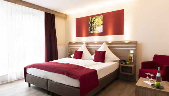 ca. 20-22 m² groß Bad mit Dusche oder Badewanne & WC Boxspringbett / Doppelbett 180 x 200cm barrierefreie Zimmer verfügbar Flatscreen-TV kostenloser WLAN Zugang (Telekom HotSpot) Föhn Bademantel auf Anfrage (kostenfrei)