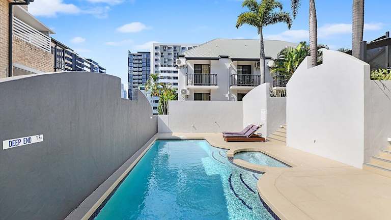 Zentral gelegenes ruhiges Hotel mit Balkon, Tiefgarage und Pool in South Brisbane. Stadtmitte Brisbane ist bequem in ca. 15 Minuten zu Fuß erreichbar.