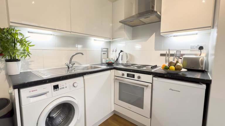 Die Ferienwohnung umfasst 1 Schlafzimmer und eine voll ausgestattete Küche mit Kühlschrank und Ofen. Das Badezimmer ist mit einer Dusche ausgestattet und bietet kostenlose Pflegeprodukte sowie eine Waschmaschine. Handtücher und Bettwäsche werden bereitgestellt.