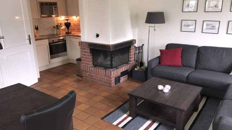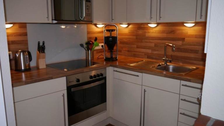 Die Ferienwohnung ist mit einer Küchenzeile ausgestattet, die über einen Kühlschrank, einen Geschirrspüler, einen Ofen, eine Kaffeemaschine und einen Wasserkocher verfügt. Es liegen keine weiteren Informationen zu Verpflegungsmöglichkeiten vor.