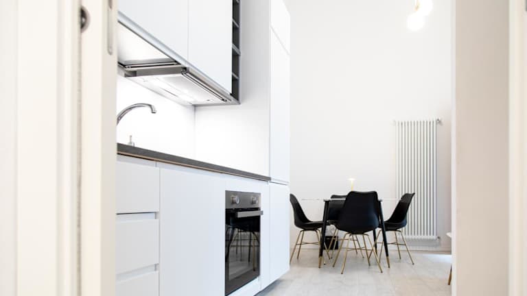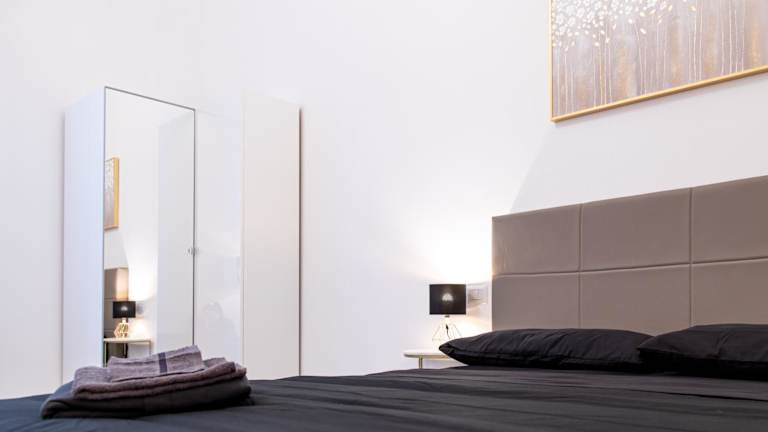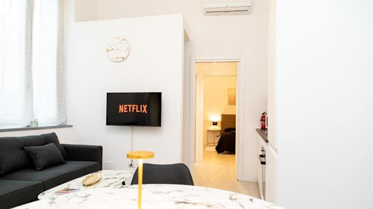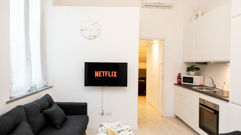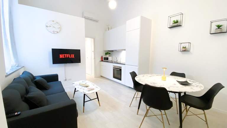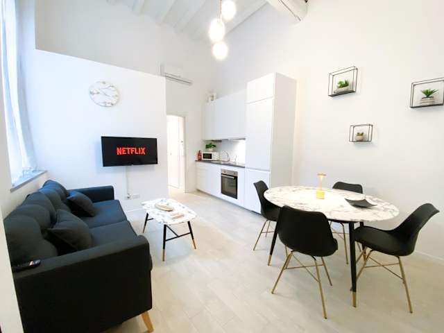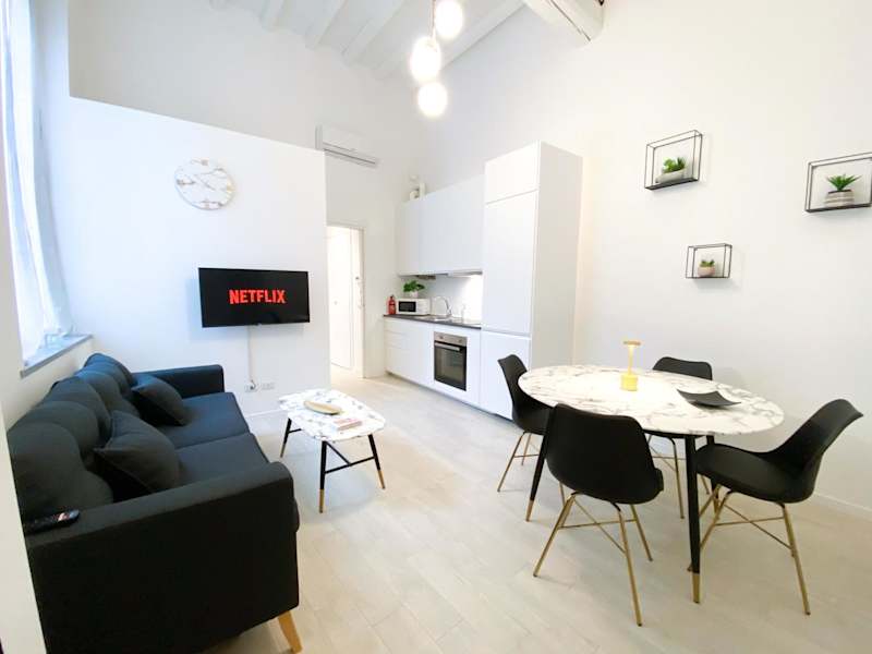 Pavia - Esclusivo appartamento in pieno centro bietet komfortable Übernachtungsmöglichkeiten in einer modernen Ferienwohnung mit Zugang zu kostenlosem WLAN und einem Flachbild-TV. Die Unterkunft ist klimatisiert und umfasst ein separates Schlafzimmer, ein Wohnzimmer sowie eine voll ausgestattete Küchenzeile.
