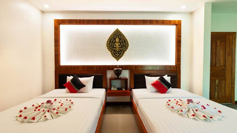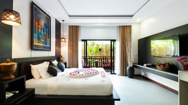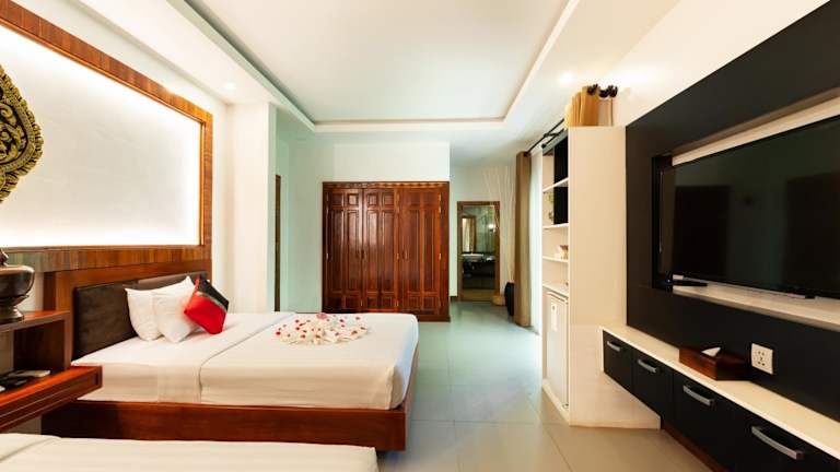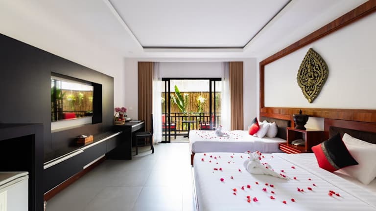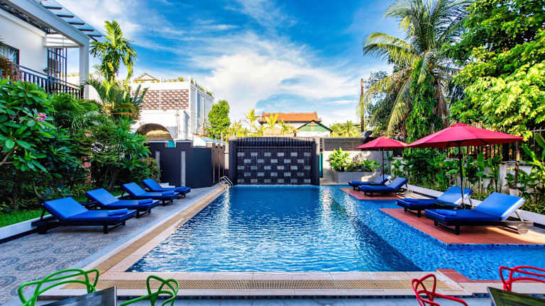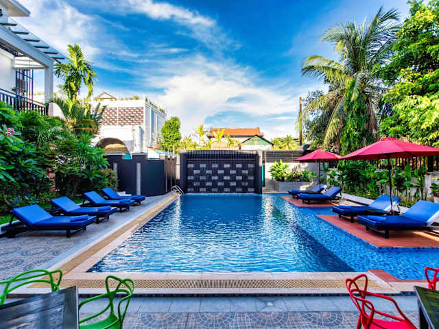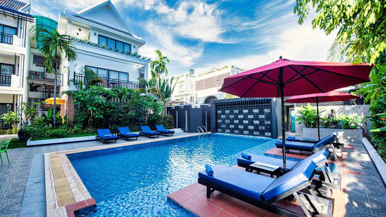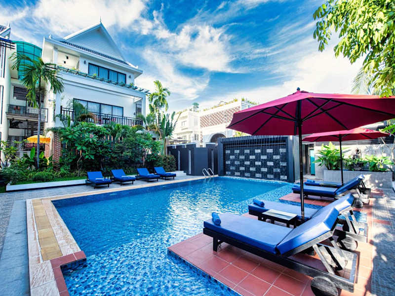 Das DOM Siem Reap ist ein charmantes Boutique-Hotel in ruhiger Lage im Wat Damnak-Viertel. Es bietet seinen Gästen einen ganzjährig geöffneten Außenpool und kostenfreies WLAN. Die Zimmer sind klimatisiert und verfügen über einen Fernseher, einen Kleiderschrank und einen Wasserkocher. Jedes Zimmer hat zudem einen eigenen Balkon, auf dem man eine Tasse Kaffee oder ein Getränk am Nachmittag genießen kann. Die Badezimmer sind mit einer Badewanne oder Dusche ausgestattet und Handtücher sowie Bettwäsche werden gestellt. Das freundliche Personal an der 24-Stunden-Rezeption steht Ihnen gerne bei der Gepäckaufbewahrung, der Buchung von Tickets und der Organisation von individuellen Touren zu den örtlichen Sehenswürdigkeiten, einschließlich der Tempel von Angkor Wat, zur Verfügung. Das Hotel bietet auch Fahrrad- und Motorradverleih an. Restaurants, Bars, Mini-Märkte, frische Lebensmittel-Märkte und Geldautomaten befinden sich in unmittelbarer Nähe. Die beliebte Pub Street ist nur 800 Meter entfernt und Angkor Wat erreichen Sie nach 7 km. Der nächstgelegene Flughafen, Siem Reap - Angkor International Airport, liegt 9 km vom DOM entfernt. Auf Wunsch bietet das Hotel auch einen Abholservice vom Flughafen oder Busbahnhof gegen Aufpreis an.