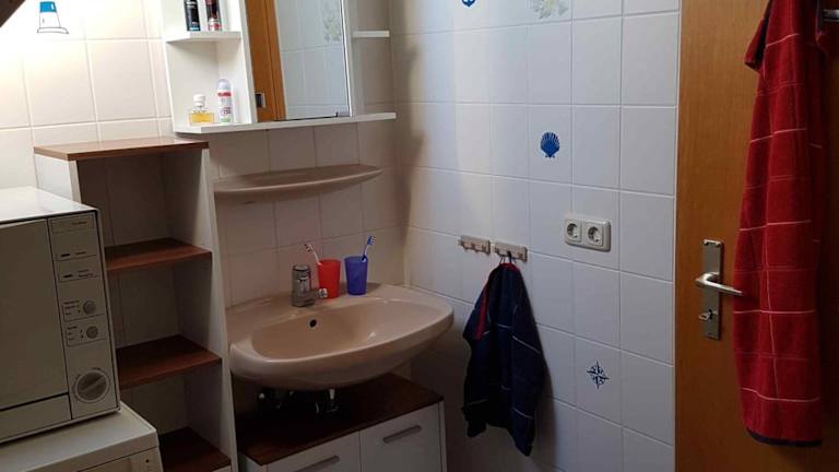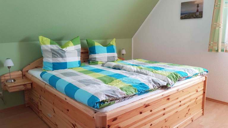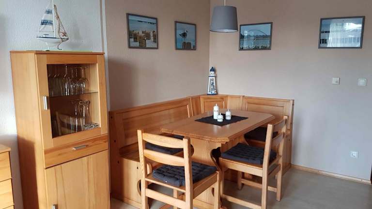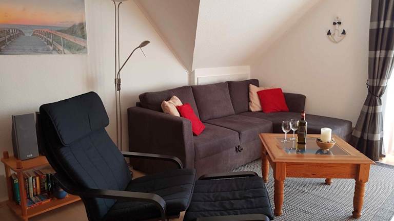 Die Ferienwohnung verfügt über einen Balkon, zwei Schlafzimmer und ein Wohnzimmer. Eine gut ausgestattete Küchenzeile mit Kühlschrank und Geschirrspüler ist ebenfalls vorhanden.