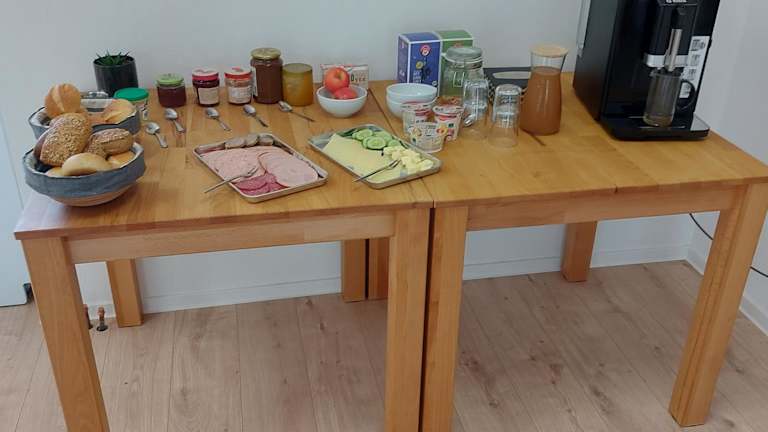 In der Pension am Bach wird ein Buffetfrühstück angeboten, das auch vegetarische Optionen umfasst.