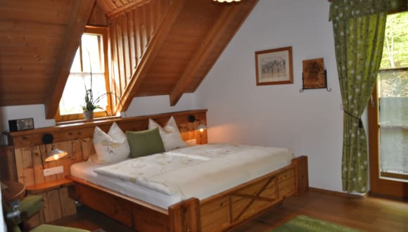 Eine gute Nacht... Keine Durchzugsstraße, keine sonstige Lärmquelle stört bei uns die Nachtruhe - lediglich das Zirpen der Grillen oder der Gesang von Vögeln wiegt sie in den Schlaf. Die geräumigen Komfortzimmer, wo nicht geraucht wird, sind mit SAT-TV, WLAN, Radiowecker, Fön, Zimmersafe, Insektenschutzgitter, Dusche und WC (getrennt) ausgestattet und verfügen teilweise über Balkon.Reserviert für Romantiker und frisch verliebte Gäste! Unser "Himmelbettzimmer" ist so richtig schön zum Kuscheln und Träumen.Und zum Ausklang eines schönen Urlaubstages genießen sie ein gutes Glas Wein aus eigener Produktion oder unserem gut sortierten Weinkeller.