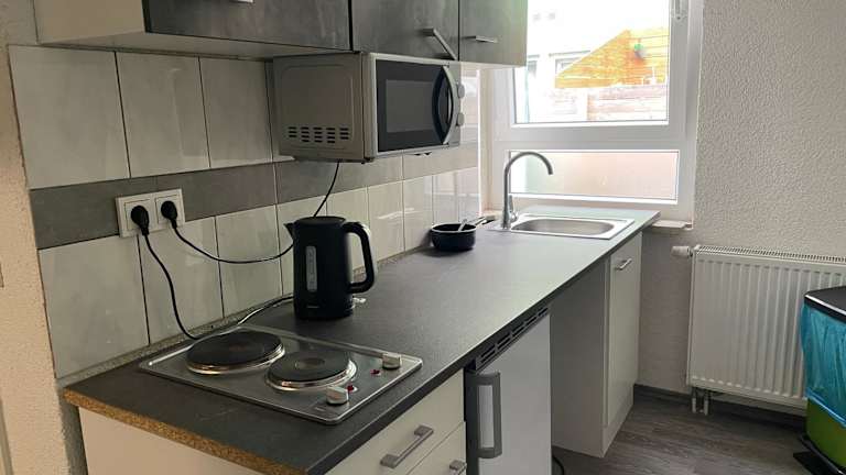 Die Ferienwohnung verfügt über eine Gemeinschaftsküche, die mit einem Kühlschrank, einer Mikrowelle, einer Kaffeemaschine und einem Wasserkocher ausgestattet ist.