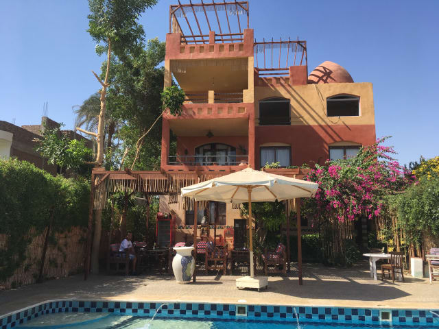 Das Hotel Nile Compound in Luxor bietet eine einzigartige Unterkunft im nubischen Stil mit kostenfreiem WLAN in den öffentlichen Bereichen. Genießen Sie den Blick auf den Nil vom Restaurant und der Dachterrasse aus. Jede Wohneinheit verfügt über eine eigene Terrasse und ist mit Sat-TV, einem Kleiderschrank und einem Schreibtisch ausgestattet. Beginnen Sie Ihren Tag mit einem leckeren Frühstück und genießen Sie Mittag- und Abendessen im Hotel. Weitere Annehmlichkeiten wie eine Gemeinschaftslounge, ein Tourenschalter und eine Gepäckaufbewahrung stehen Ihnen zur Verfügung. Die Nähe zu den Tempeln von Luxor und dem internationalen Flughafen Luxor machen dieses Hotel zu einem idealen Ausgangspunkt für Ihre Erkundungen in der Region.