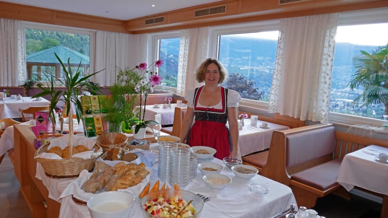 Unsere sonnige und ruhige Lage am Beginn des Algunder und Marlinger Waalweges, die prächtige Aussicht auf die Talweite der Kurstadt Meran und die entspannte Atmosphäre des gemütlichen Familienbetriebes mit einem liebevoll zubereiteten Frühstücksbuffet bieten Ihnen die besten Voraussetzungen für einen entspannten und erlebnisreichen Urlaub. Nach der Wanderung können Sie sich in unserem neuen Indoor Hot Whirlpool oder im beheiztem Freibad mit hautfreundlichem Salzwasser und Panoramablick entspannen. Unsere geräumigen Zimmer sind renoviert und stilvoll ausgestattet. Oder verbringen Sei Ihren Urlaub lieber in unseren neu erbauten Ferienwohnungen in unserem "alten Stadel". Es ist eine Verbindung aus „Alt und Neu“, denn den Typus des Stadels soll man noch spüren. Die Linien des Hauses sind einfach und klar, und unsere neuen und gemütlichen Wohnungen bieten genügend Platz, zum Entspannen und Genießen! Die Wohnungen haben einen umwerfenden Blick auf die Kurstadt Meran, ein modernes Bad, eine voll eingerichtete Küche mit Spülmaschine, sowie Bodenheizung und Klimaanlage. Ihr Urlaubstag beginnt mir einem leckeren Frühstücksbuffet mit einheimischen Produkten, Südtiroler Speck und Käse, Schinken und verschiedenen Wurstsorten und Aufstriche, Müsli aus dem Vinschgau und Meraner Jogurt, dunkle und helle Brotsorten und ein frisch zubereiteter Obstsalat fehlen nie. Die verschiedenen Eierspeisen werden persönlich serviert. Wohnen Sie in der Ferienwohnung, dann können Sie das Frühstück dazu buchen. Für Ihr Bike haben wir einen sicheren Radraum und wir verfügen auch über eine Elektrotankstelle für Ihr Elektroauto. Unser ebener und zum Teil Kiwiüberdachter Parkplatz bietet genügend Platz für jedes Auto. Mit dem Südtirol GuestPass Algund können Sie kostenfrei Bus und Zug fahren, in 80 Museen gehen und mit 6 Seilbahnen fahren. Die Bushaltestelle befindet sich vor dem Haus und der Bus bringt Sie nach Algund und Meran, sowie nach Partschins und in den Naturpark Texelgruppe. In unserem Naturpark finden Sie Wanderungen mit einem einfacheren und schwierigeren Leistungsgrad vor. Der Meraner Höhenweg, der untere Felsenweg und die Wanderung zu den Spronser Seen sind unvergesslich! Nach der Wanderung erwartet sich unser Außenpool oder unser Indoor Hot Whirlpool um die Muskeln zu entspannen. Kalte Getränke und kleine Imbisse sind im Haus erhältlich.
