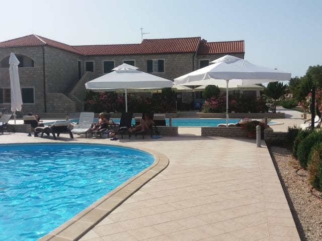 Die Pansion Skelin in Drinovci ist ein charmantes Hotel, umgeben von malerischen Olivenhainen und Weinbergen. Hier können Sie einen entspannten Urlaub inmitten der Natur genießen und gleichzeitig Annehmlichkeiten wie einen Swimmingpool und Tennisplätze nutzen. Die geräumigen Zimmer bieten einen Balkon mit Gartenmöbeln und sind mit allen modernen Annehmlichkeiten ausgestattet. Das hoteleigene Restaurant serviert köstliche einheimische Spezialitäten, darunter hausgemachter geräucherter Schinken. Täglich werden geführte Ausflüge in die umliegenden Sehenswürdigkeiten angeboten, wie den Krka-Nationalpark und die Insel Visovac.