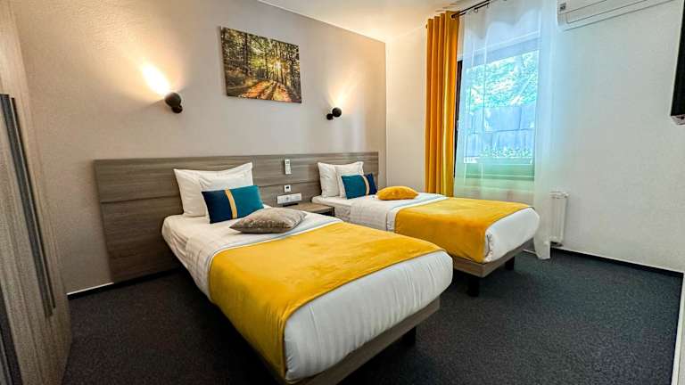 Die Gästezimmer sind ausgestattet mit einem Flachbild-TV mit Kabelkanälen, Kühlschrank, Kaffeemaschine und Dusche. Jedes Zimmer verfügt über ein eigenes Badezimmer mit Haartrockner. Zusätzliche Annehmlichkeiten umfassen Bettwäsche und Handtücher, zudem bieten einige Zimmer Balkone und andere einen Blick auf die umliegenden Berge.