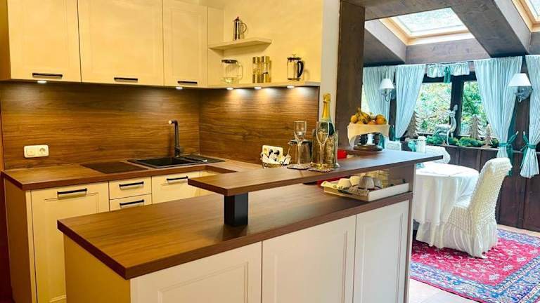 Die Suite verfügt über eine vollständig eingerichtete Küche mit Kühlschrank und Geschirrspüler, in der die Zubereitung von Mahlzeiten möglich ist.